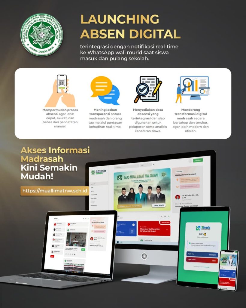 Anjani, Lombok Timur — MA Mu’allimat NW Anjani hari ini secara resmi meluncurkan inovasi terbaru berupa Absen Digital dengan nama Sistem Mu’allimat Digital (SIMUDA). Acara yang berlangsung di Aula Utama MA Mu’allimat NW Anjani ini dihadiri oleh Kepala Madrasah, para Wakil Kepala Madrasah, dewan guru, staf tata usaha, seluruh siswa, serta wali murid dari seluruh santri yang turut hadir memenuhi Aula Utama.